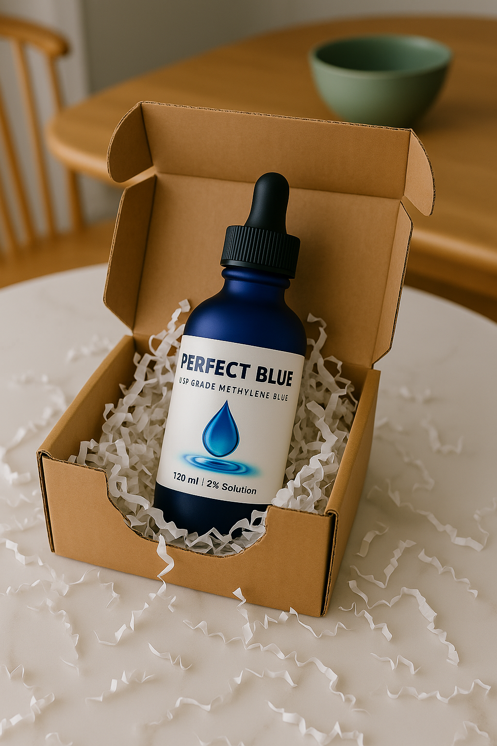 Perfect Blue is the high-purity, USP-grade Methylene Blue for sale online in Canada. Our Methylene Blue is offered at a 2% super concentration, in 120 mL frosted blue dropper bottles for maximum value, proper storage, and precision handling. FREE SHIPPING!